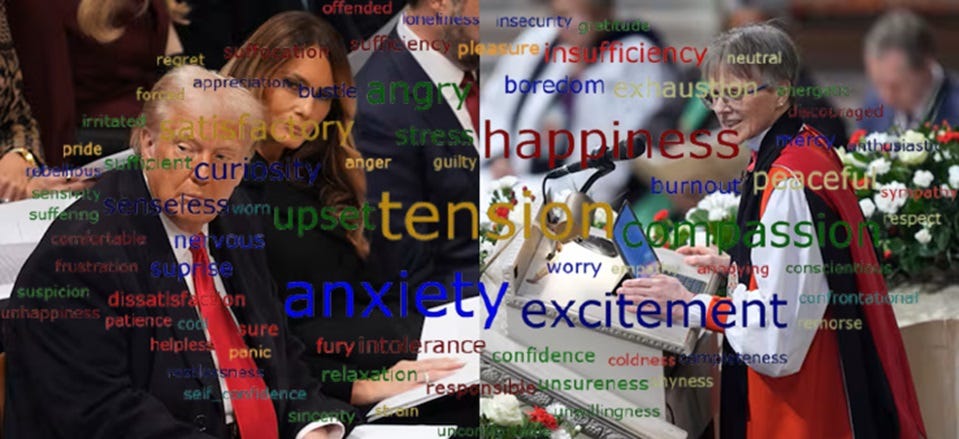 While a discomfited Trump, perturbed that his post-inaugural photo op would be desecrated by his own name in the mouth of an Episcopal bishop, and outraged that the Bishop should summon him - and not just God1 - to be merciful, is hardly alone among powerful leaders who are poorly equipped to name (setting aside his capacity to actually wrestle and reckon with) his emotions, this deficit in someone of his rank and station in life is the inevitable manifestation of an endemic emotional vocabulary deficit that is particularly hard-hitting among boys and men in America.